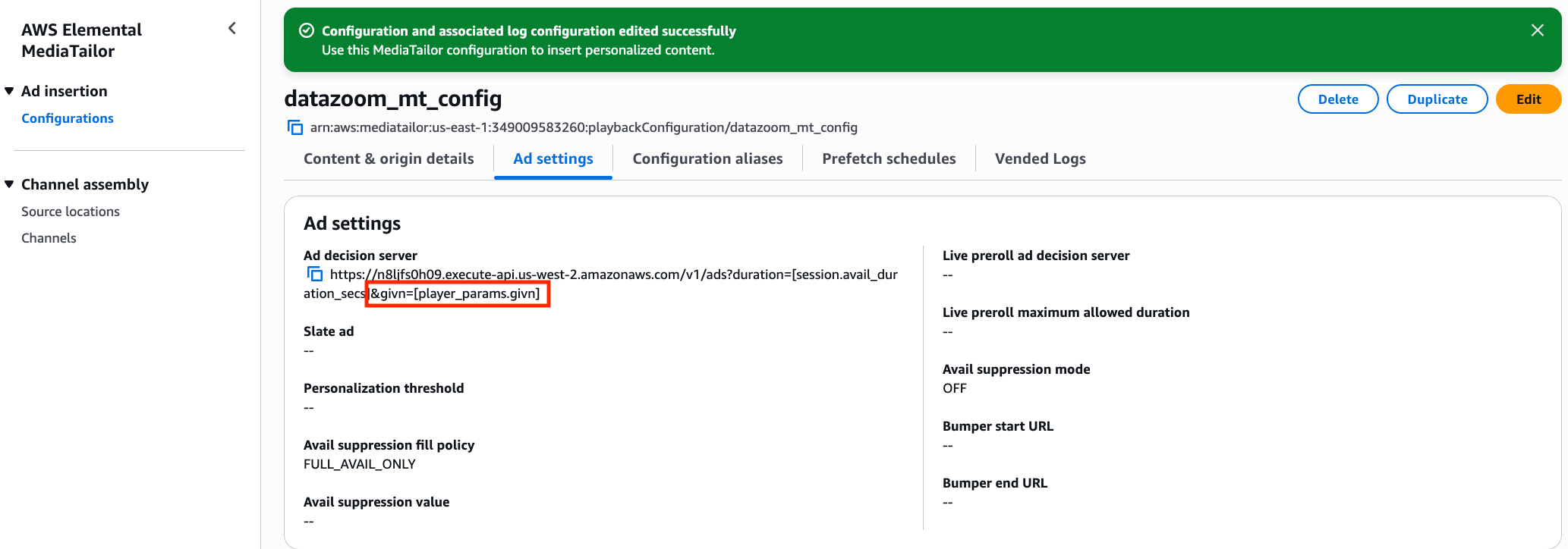 Provide Givn for Google PAL support. If you are using Google PAL integration, you need to add a single parameter to your Ad decision server URL to support the Google PAL SDK in the MediaTailor console: &givn=[player_params.givn]